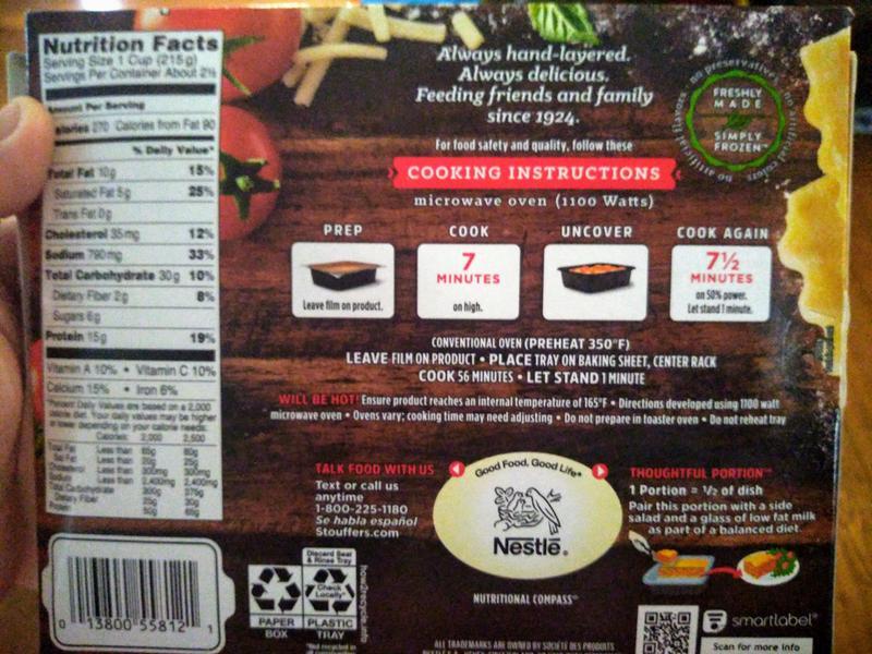 I'm taking a break from the news, for food. Stouffer's large family size meat lovers lasagna frozen meal combines quality ingredients and delicious flavor into one easy dinner. Leave film on tray, do.